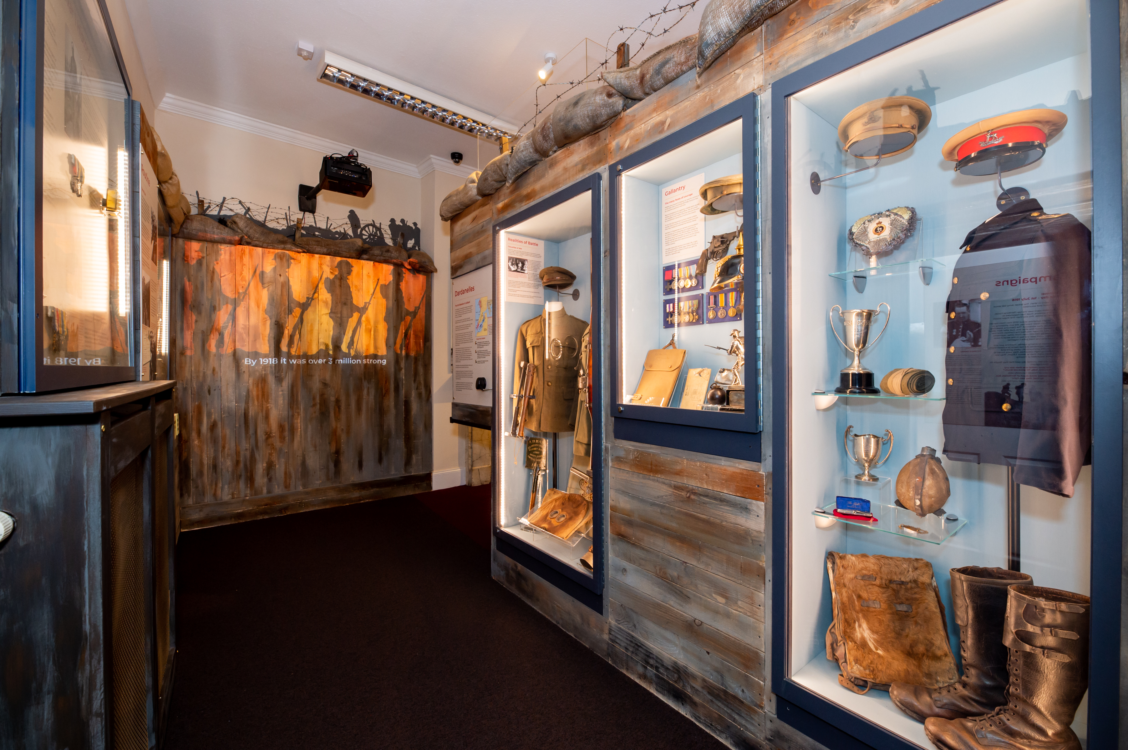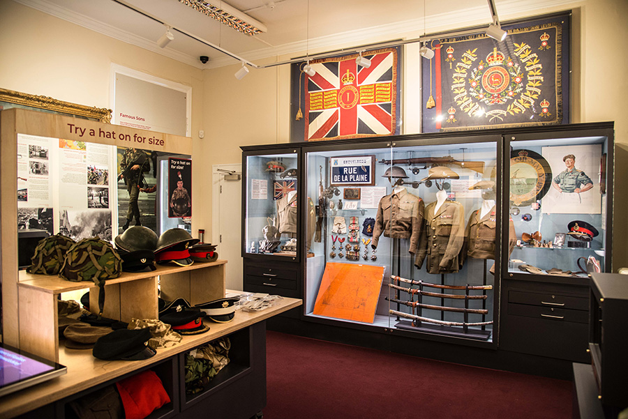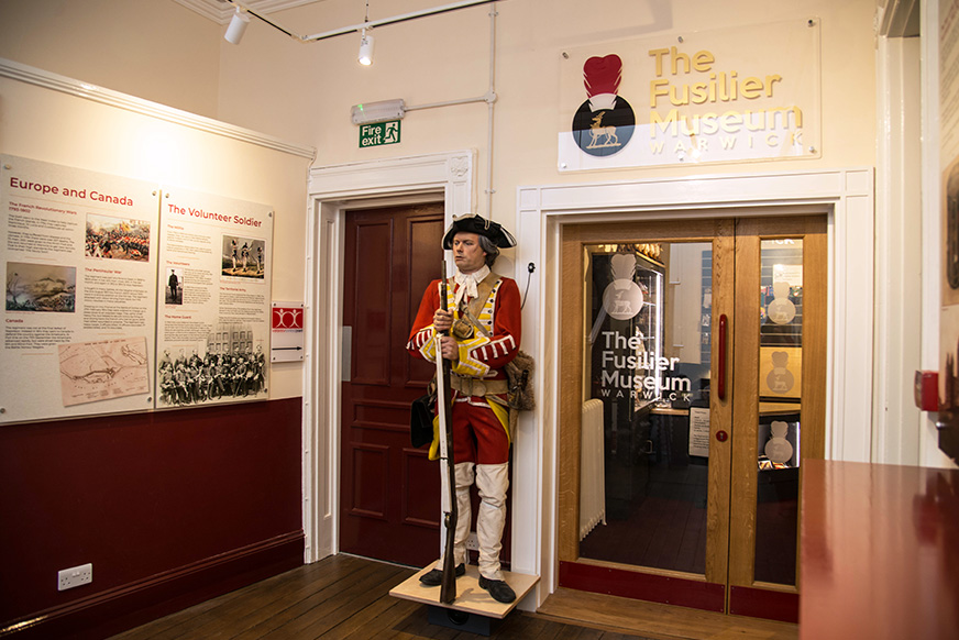 As you enter the lobby of Pageant House, you are presented with an introduction to the museum and what lies upstairs. A broad wooden staircase lined with images of people connected with the regiment’s history brings you to a first-floor landing. Here surrounded by information panels about the early history of the museum, a 18th century soldier explains a little more what you will see inside.